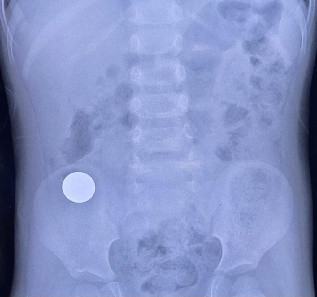 Round metallic density projected over right iliac fossa in keeping with a coin. No features of bowel obstruction.